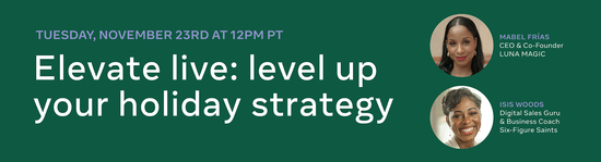 This final Elevate Live of the year will invite Digital Sales Guru and Business Coach, Isis Woods, to share tactical strategies on how to plan and create content that converts, and CEO & Co-Founder of LUNA MAGIC, Mabel Frías, to share her best practices for leveraging Shops to increase awareness of your products and drive sales for your business.